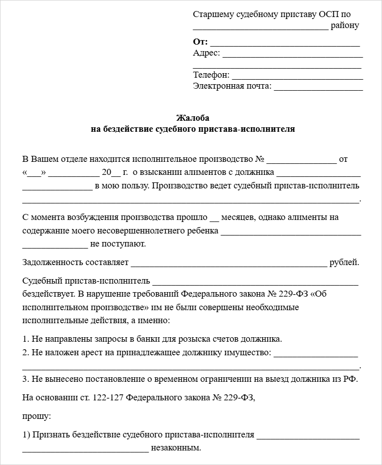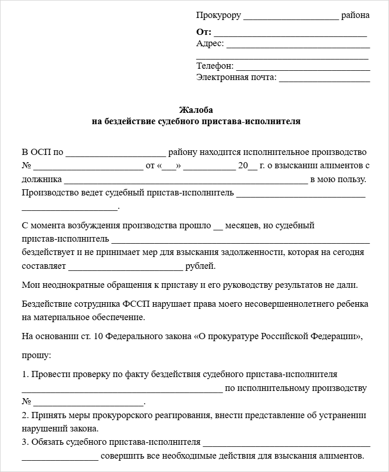 Шапка. В правом верхнем углу укажите адресата: «Старшему судебному приставу ОСП по такому-то району» или «Прокурору такого-то района». Ниже впишите свои данные: ФИО, адрес и телефон.