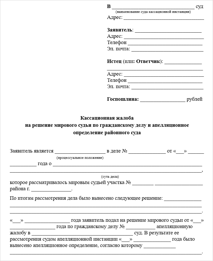 Какой суд рассматривает | Вышестоящий. Например, жалобу на решение мирового судьи рассматривает районный суд. | Кассационный суд общей юрисдикции. При несогласии с решением и продолжением обжалования — Верховный Суд РФ. |