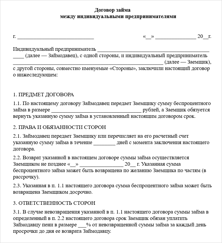 Оставляем инструкцию, как правильно оформить договор беспроцентного займа между двумя ИП.