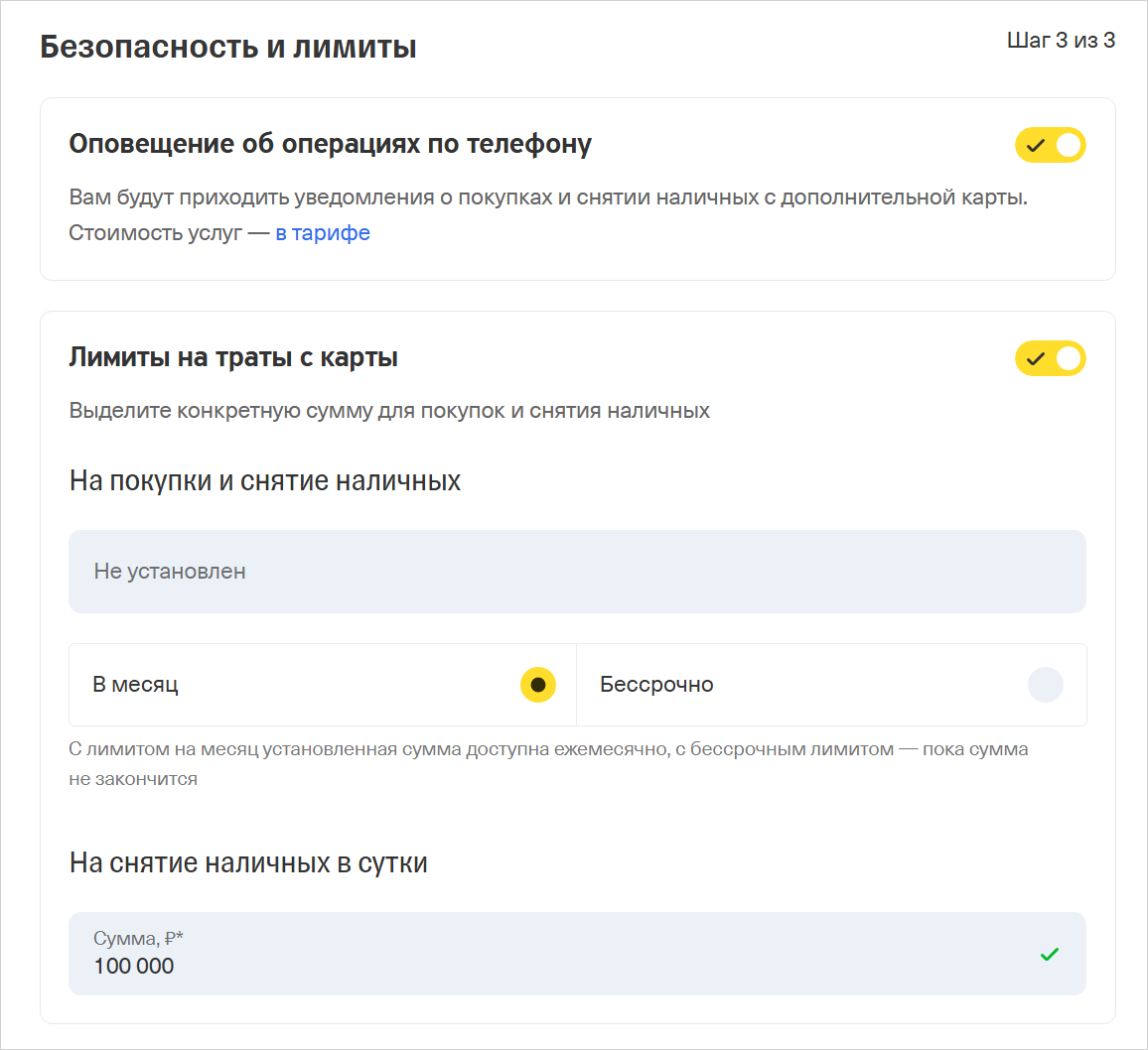 Шаг 6. Настройте лимиты и оповещения и нажмите «Оформить».