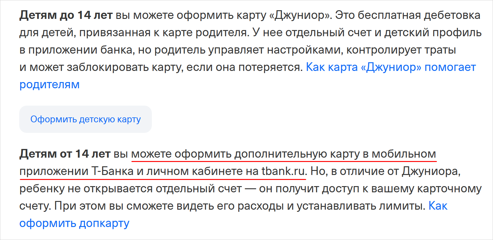 Детям старше 14 лет оформляют дополнительные дебетовые карты к карте родителя, например к пластику «Тинькофф Блэк», или обычные дебетовые карточки Т-Банка, но с согласия родителя.