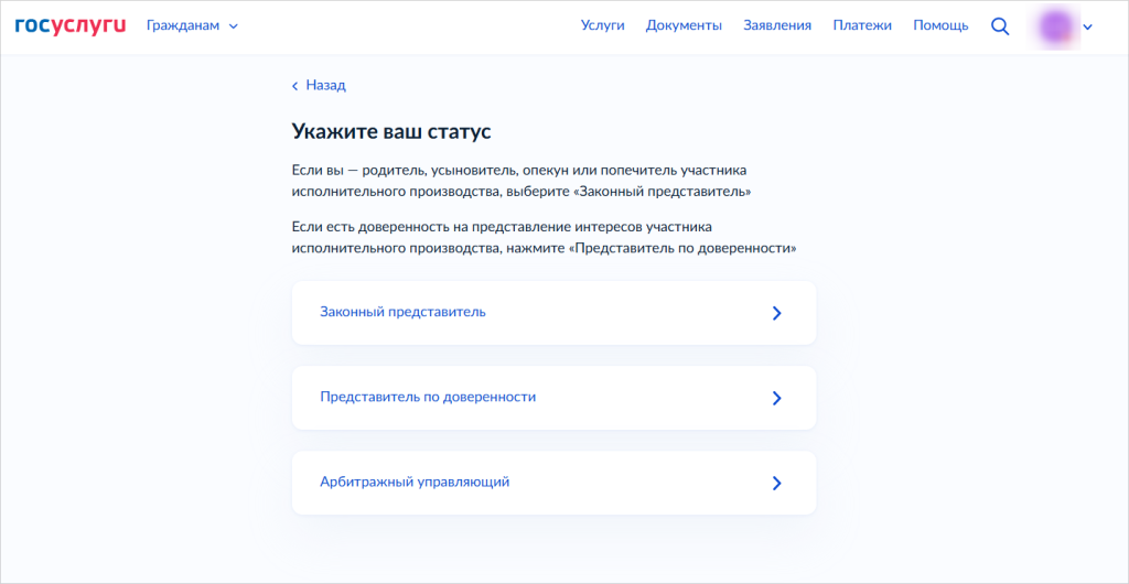 Доверенность можно предъявить на Госуслугах. Выберите «Подача заявлений и ходатайств в ФССП» и отметьте, что обращение подает представитель по доверенности. В тексте обращения попросите пристава принять доверенность и приобщить ее к материалам исполнительного производства. Заявление рассмотрят в течение 17 дней.