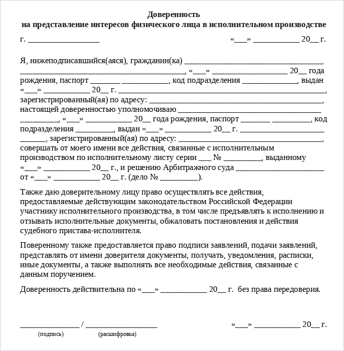 Отсутствует срок действия | Тогда доверенность остается действительной только год. Если исполнительное производство затянется, придется оформлять ее повторно. |
