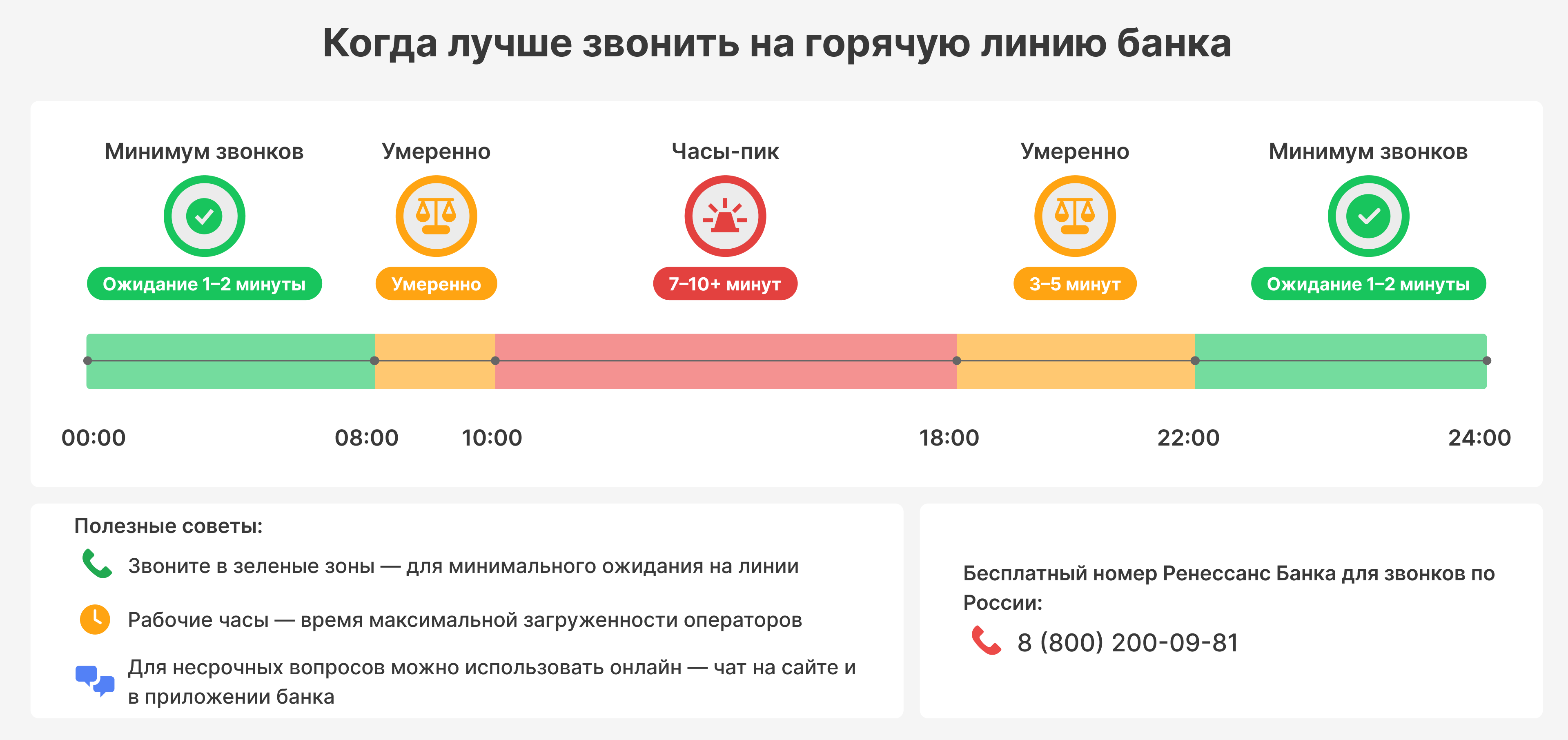 В часы пик время ожидания ответа специалиста может быть длительным — от 7–10 минут. По несрочным вопросам лучше звонить ранним утром или поздним вечером. По статистике в это время меньше звонков и линия не перегружена.