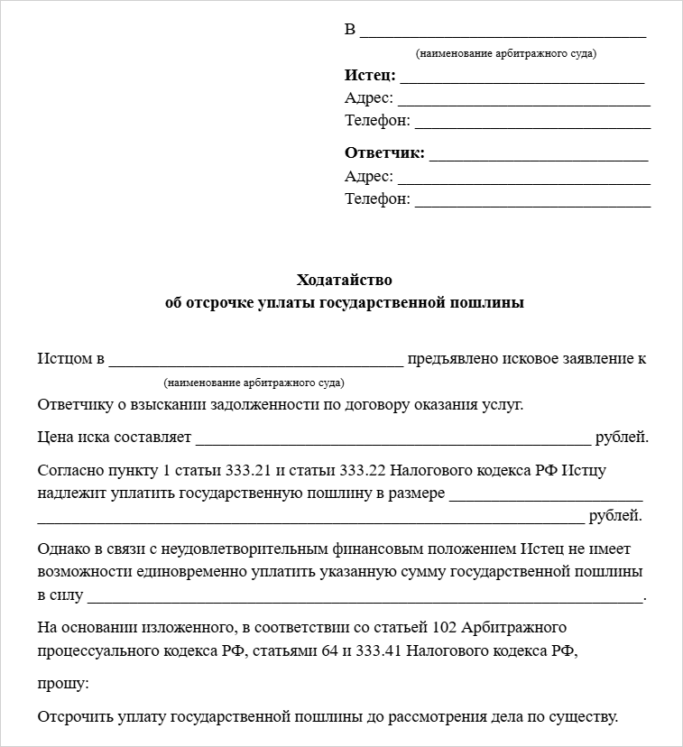 Арбитражный суд может дать заявителю отсрочку или рассрочку на уплату госпошлины. Но для этого необходимо доказать тяжелое финансовое положение, возникшее, например, из-за других долгов, потери работы, заболевания, инвалидности. Каждую просьбу об отсрочке суд рассматривает индивидуально — это тот случай, когда предугадать его решение невозможно.