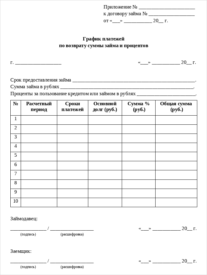 Иногда договор займа заключают физлица с микрофинансовыми организациями — когда берут небольшие суммы в долг до зарплаты. Если микрозайм предполагает погашение единым платежом, то график составлять необязательно.