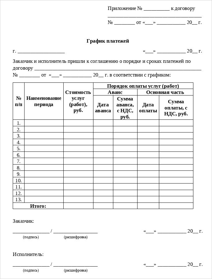 График платежей — это таблица с датами, размерами и сроками платежей по договору. Это не самостоятельный документ, а приложение к основному соглашению. График является юридически значимым документом, если договор подписан обеими сторонами.