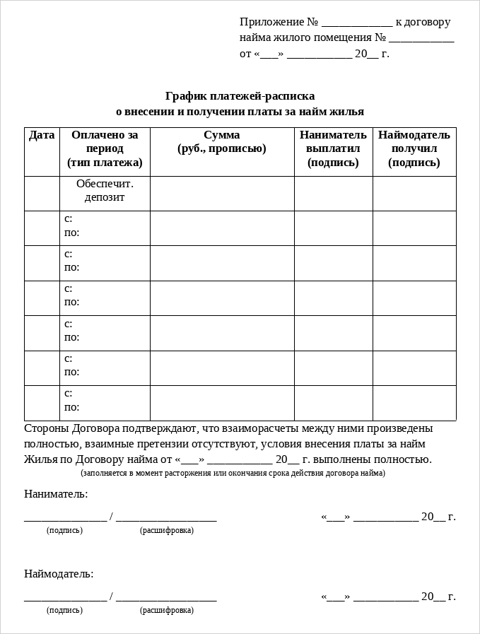 Договор найма применяют как для посуточной, так и для долгосрочной аренды. График платежей часто привязывают к первому числу месяца или дате подписания договора. В случае задержки оплаты возможна неустойка.