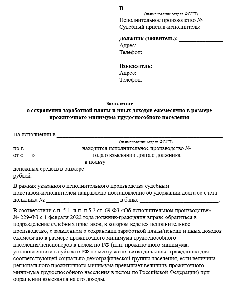 Если на жизнь остается меньше прожиточного минимума, должник может защитить его от списания — для этого необходимо подать приставу заявление.