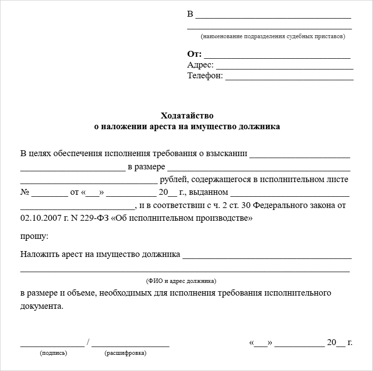 Должники и взыскатели могут влиять на ход исполнительного производства. Для этого они подают ходатайства приставу, который ведет дело. Просят оставить прожиточный минимум, отложить исполнительные действия или, наоборот, разыскать и арестовать имущество должника. Мы расскажем, как правильно написать ходатайство приставу, и поделимся образцами.