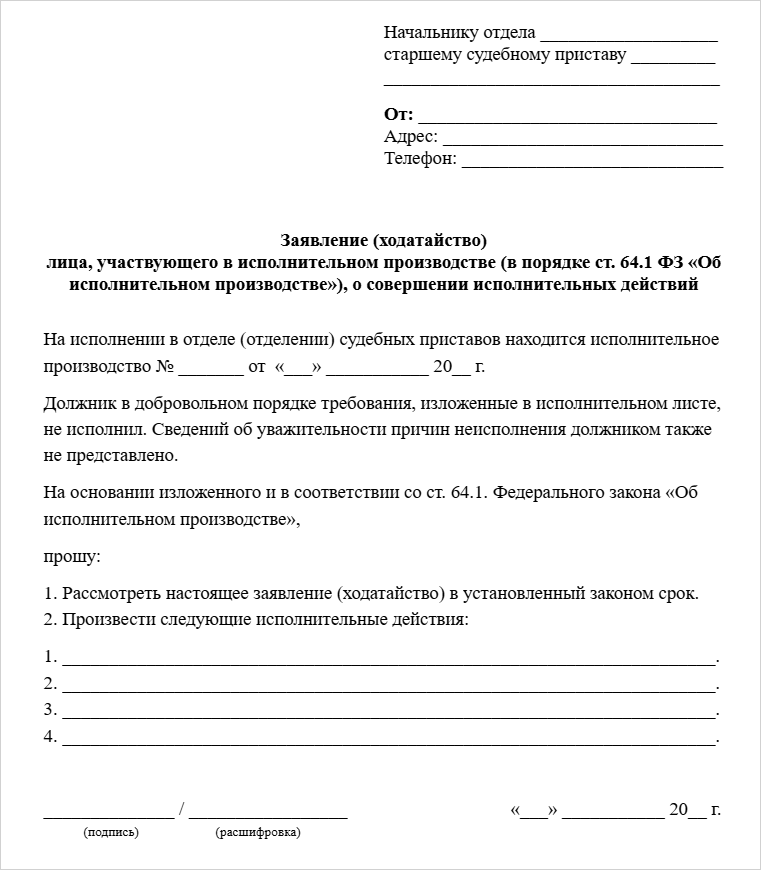 Судебному приставу подают ходатайства о проведении разных исполнительных действий, перечислим основные.