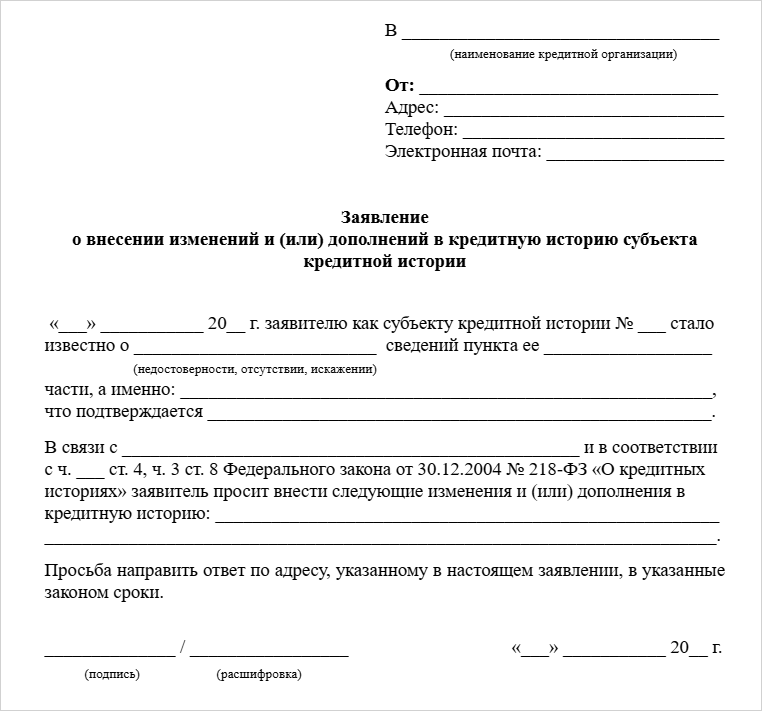 Если нашли чужой долг или запись о просрочке, которой на самом деле не было, подайте заявление на ее исправление в банк. Заявление рассмотрят в течение 15 дней, и если ошибка подтвердится, банк передаст обновленную информацию в бюро. Кредитная история станет лучше, а персональный рейтинг — поднимется.