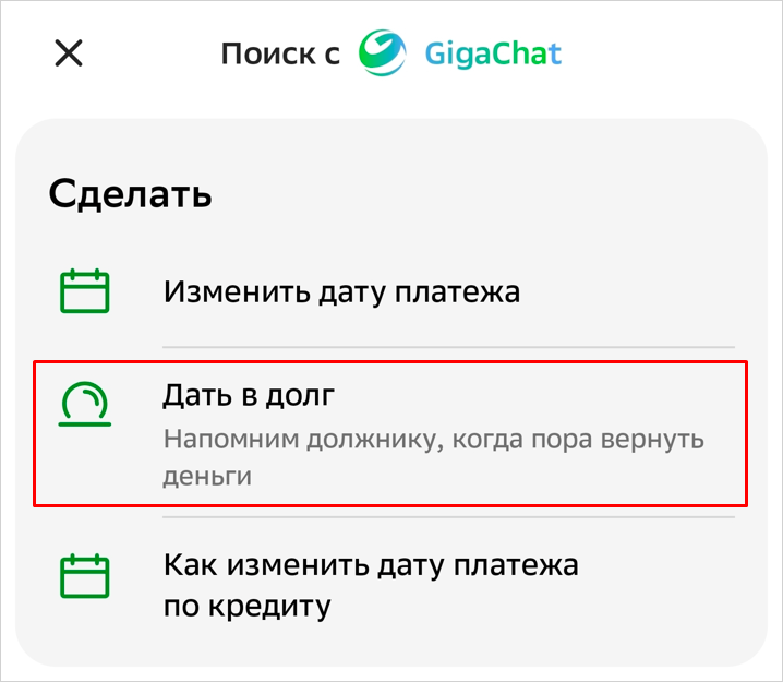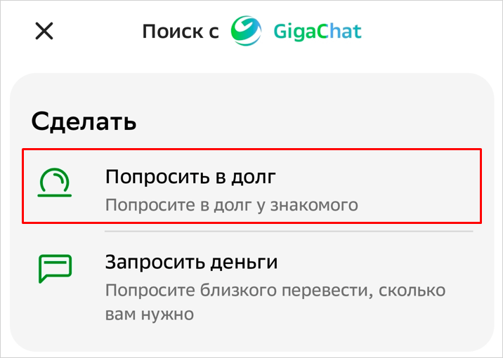 - Найти опцию «Попросить в долг» через поисковую строку.