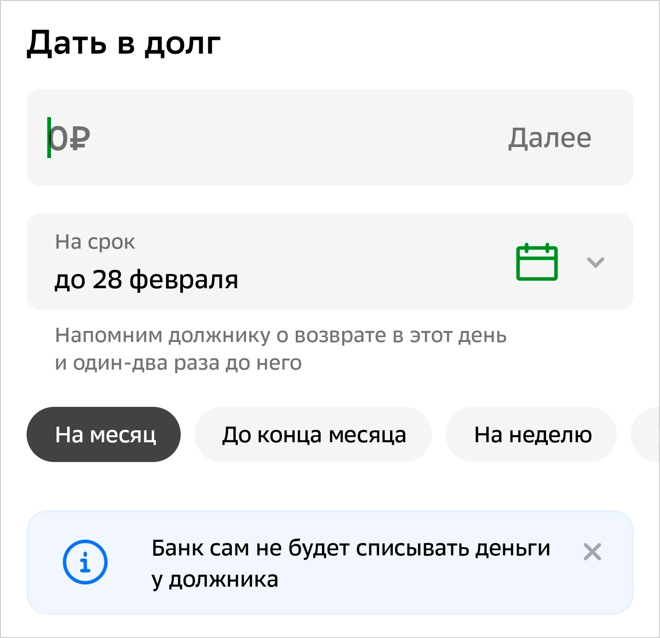 В 2021 году Сбербанк запустил удобную функцию в приложении «Сбербанк Онлайн» под названием «Дать в долг». Сервис фиксирует факт долга и напоминает должнику о своевременном возврате денег.