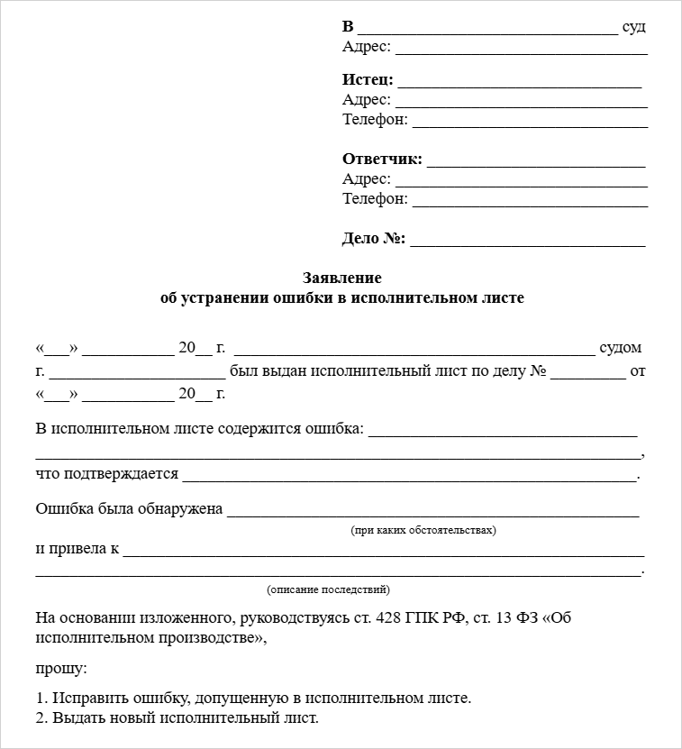 В основной части укажите обстоятельства, при которых в исполнительном листе обнаружили ошибку. Затем опишите последствия, к которым она привела. Например, приставы взыскали не 50 тысяч, а вдвое больше — 100 тысяч рублей. Или, наоборот: не смогли найти счета и имущество должника. Завершите заявление просьбой исправить неточность и выдать новый исполнительный лист.