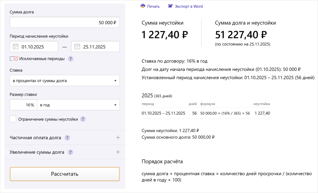 Чтобы посчитать пени за просрочку платежа, воспользуйтесь онлайн-калькулятором. Например, от правовой системы «КонсультантПлюс». Для расчета укажите сумму задолженности, период начисления неустойки и ставку для пеней: в процентах, по ключевой ставке Центробанка, в твердой сумме. Можно добавить ограничение по размеру неустойки и, например, информацию о частичном погашении долга.