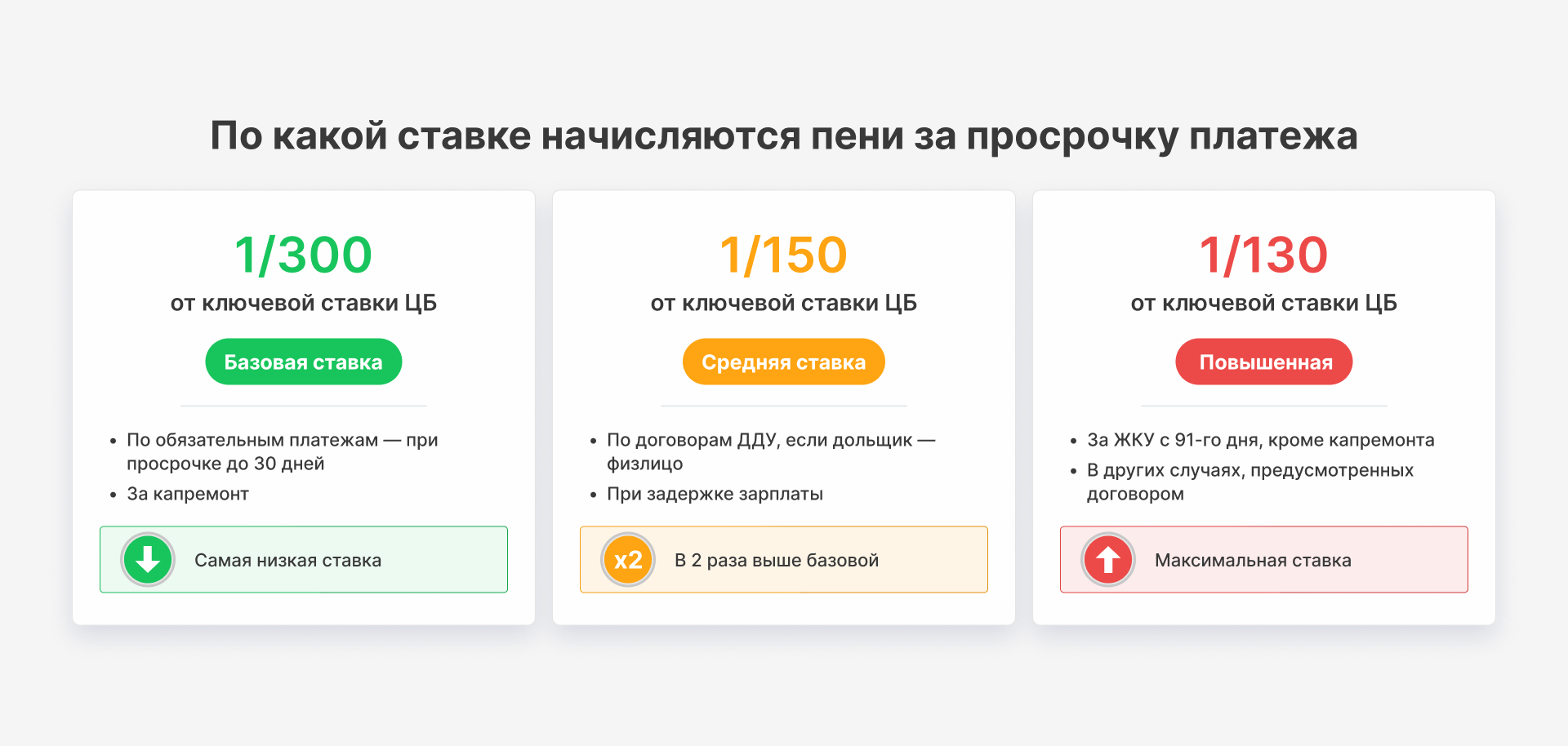 Для ИП ставка пени составляет 1/300 ключевой ставки ЦБ РФ за каждый день просрочки.