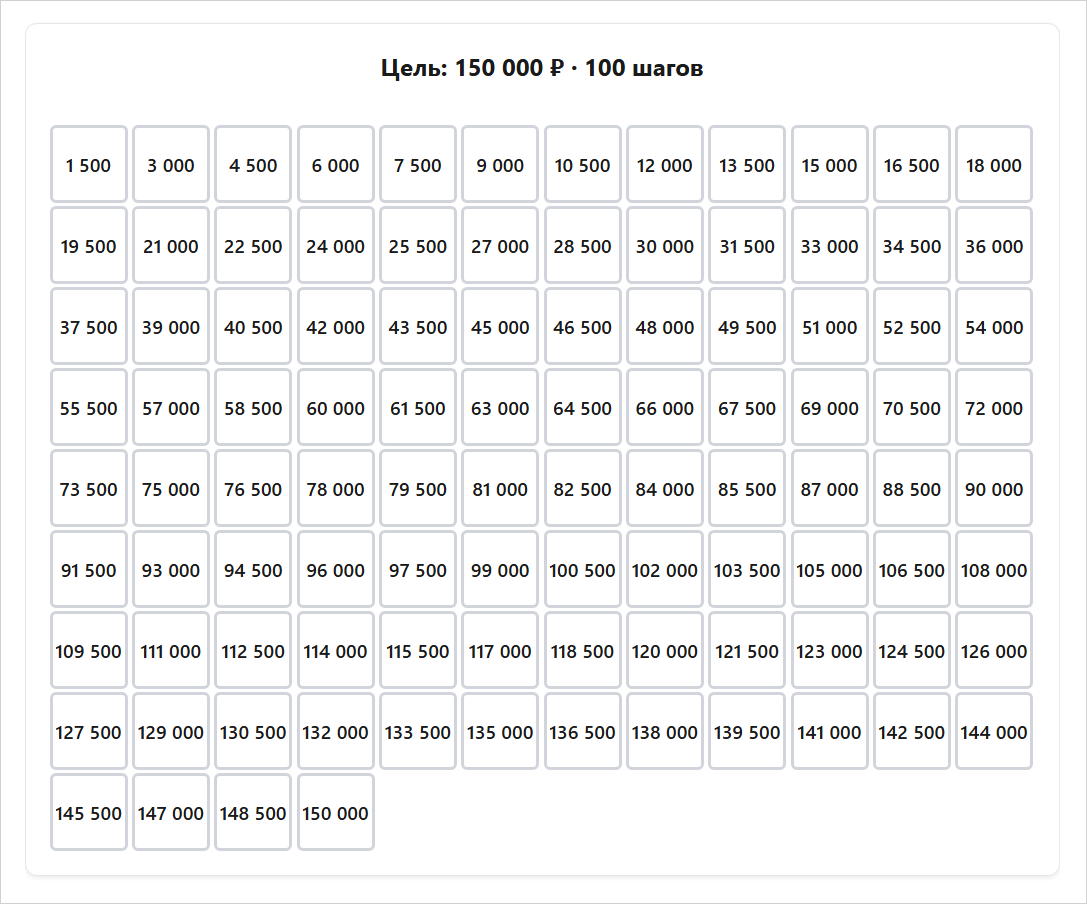 Как копить деньги по таблице с целью 150 тысяч рублей