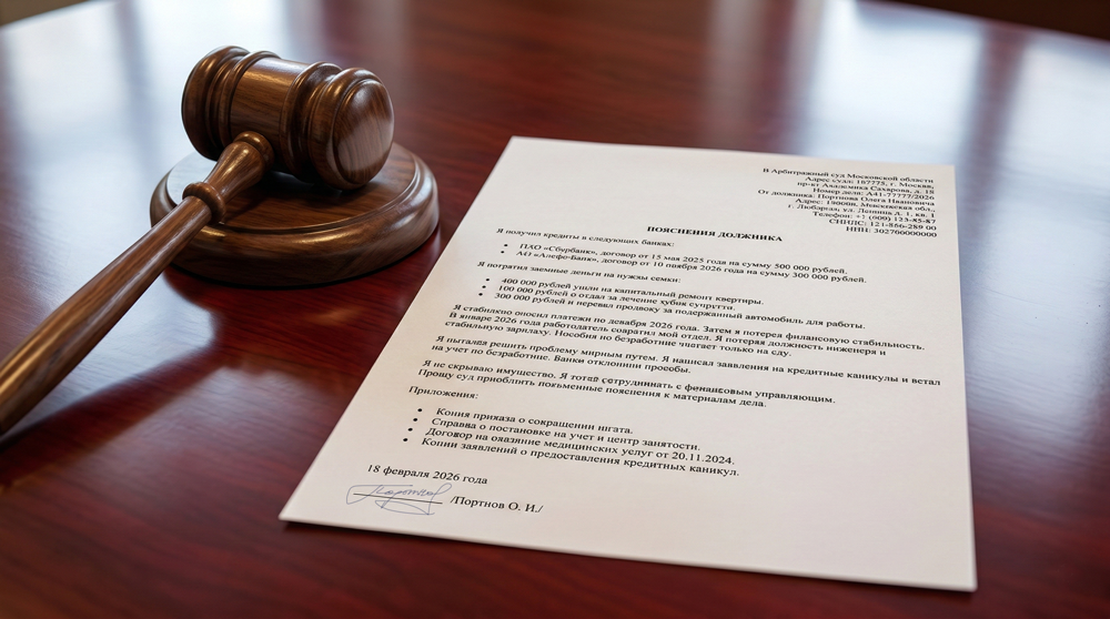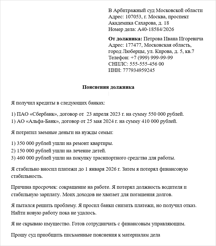 На практике пояснение в деле о банкротстве снимает большую часть вопросов — со стороны судьи, кредиторов и финансового управляющего. Без него суд будет восстанавливать картину только по цифрам. А с ним — видит живого человека и понимает его историю.