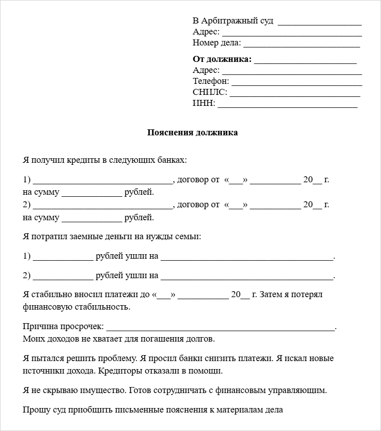Ответ в письменной форме часто снимает лишние вопросы со стороны суда, кредиторов, в будущем — еще и финансового управляющего. Юристы часто называют такой документ пояснительной запиской. Это не официальный термин, но суть дела от этого не меняется.
