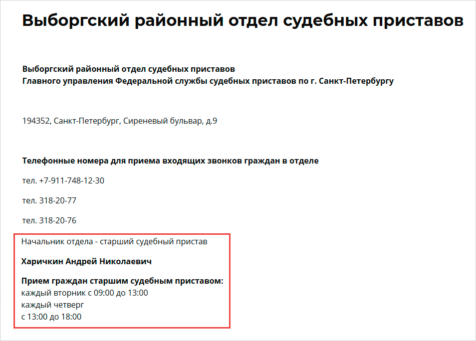 Посмотреть на сайте регионального управления ФССП. Перейдите в раздел «Контакты», далее — «Адреса и телефоны структурных подразделений». Найдите свой городской или районный отдел — на его странице будет указана фамилия старшего пристава и время приема граждан.