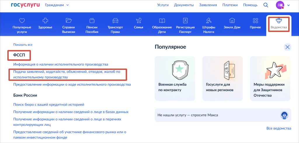 В главном меню откройте раздел «Ведомства», выберите «ФССП» и сервис «Подача заявлений, ходатайств, объяснений, отводов, жалоб по исполнительному производству».