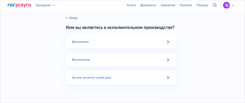- Выберите свой статус в исполнительном производстве: должник, взыскатель или представитель (если действуете по доверенности).