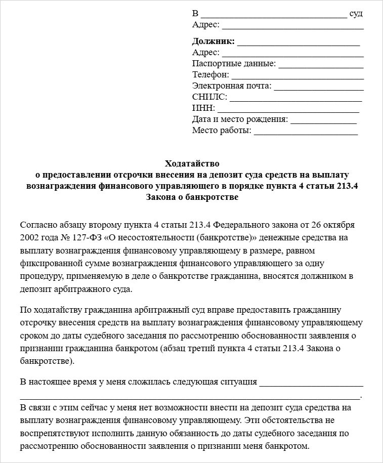 | Отсутствие средств на депозите суда | Если нет денег, чтобы оплатить вознаграждение управляющему, необходимо подать ходатайство об отсрочке. Иначе суд оставит заявление о признании банкротом без рассмотрения или приостановит производство по делу. |