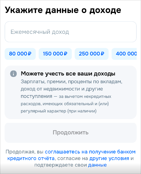 Далее — указать размер дохода. И чтобы повысить вероятность одобрения, Озон Банк запрашивает доступ к Госуслугам. Одобрять его или нет — решать вам. Для чистоты эксперимента мы отказали в доступе, но Озон Банк все равно одобрил карту.