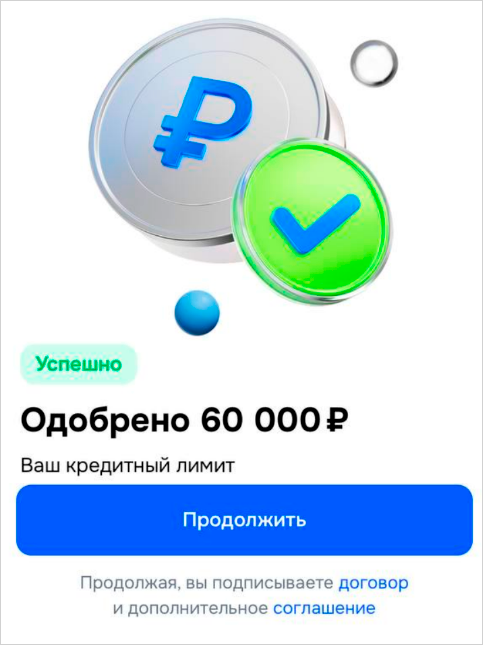 Дождаться решения — оно появится в течение минуты. Для подписания договора не нужно вводить код из смс, достаточно выбрать «Продолжить». Только не соглашайтесь сразу — сначала посмотрите проценты и другие индивидуальные условия договора.
