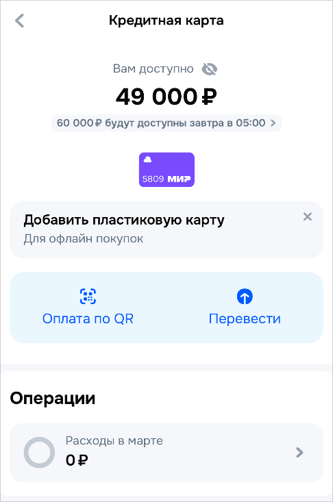Виртуальная кредитка сразу появляется в личном кабинете, но только с лимитом 49 000 рублей. Остальная сумма будет доступна чуть позднее — когда истечет период охлаждения, обязательный для банков с 2025 года.
