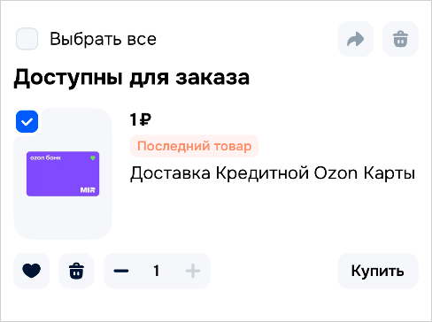 - Добавьте карту в корзину. В приложении или на сайте Ozon перейдите в раздел банковских продуктов и выберите опцию «Добавить пластиковую карту».