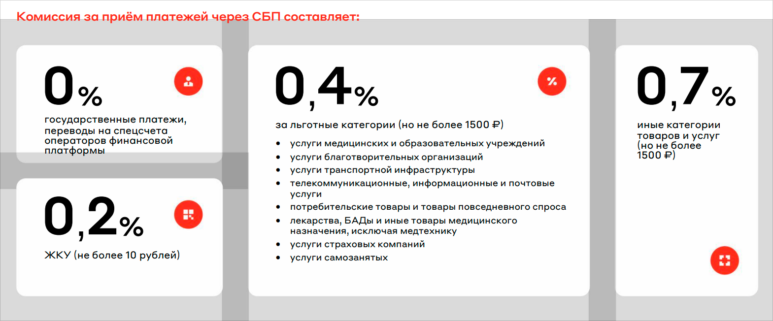 Подключая оплату по QR-коду Альфа-Банка, индивидуальные предприниматели экономят на установке банковского терминала. Деньги поступают на расчетный счет бизнеса в течение нескольких секунд после подтверждения оплаты покупателем. Размер комиссии для таких платежей регулируется Центробанком РФ и примерно в 5 раз ниже, чем для традиционного банковского эквайринга. Процент зависит от типа бизнеса: