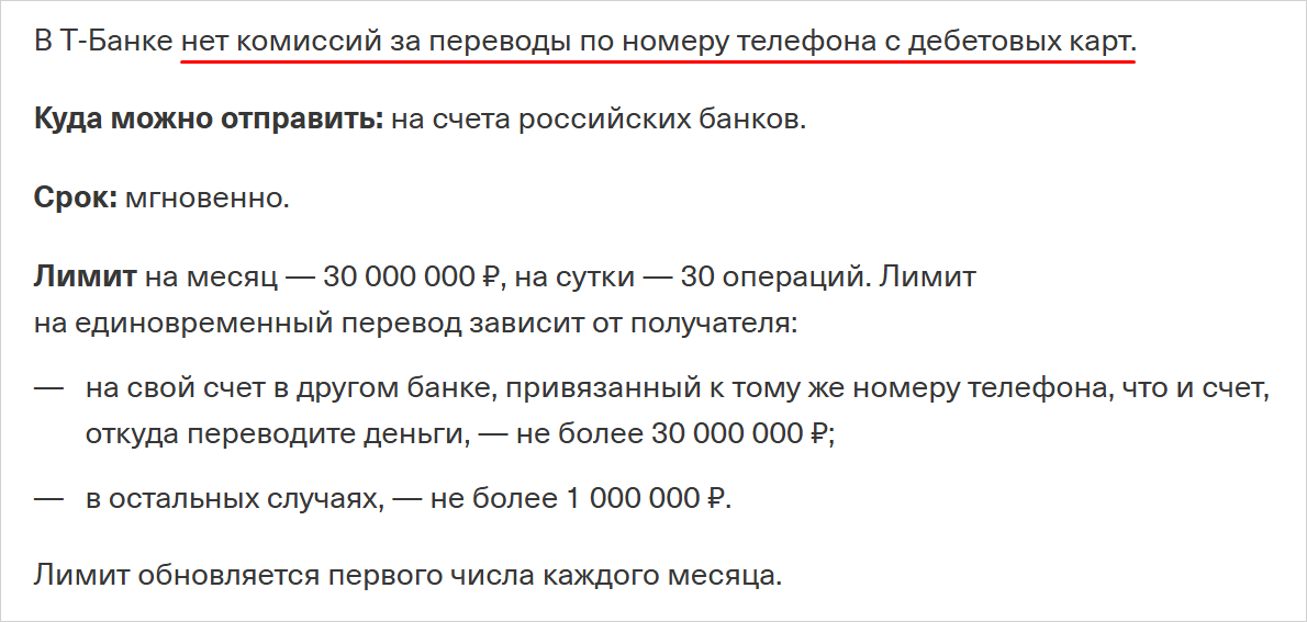 По номеру телефона можно переводить на чужие счета не более 30 млн рублей в месяц. Внутреннюю комиссию за такие операции Т-Банк не берет, но, поскольку перевод все равно будет выполнен через СБП, нужно помнить об общих для этой системы ограничениях.