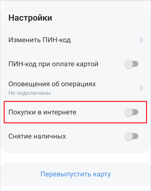 И наоборот: если в целях безопасности хотите запретить оплату картой в интернете, переведите переключатель в положение «Выключено».