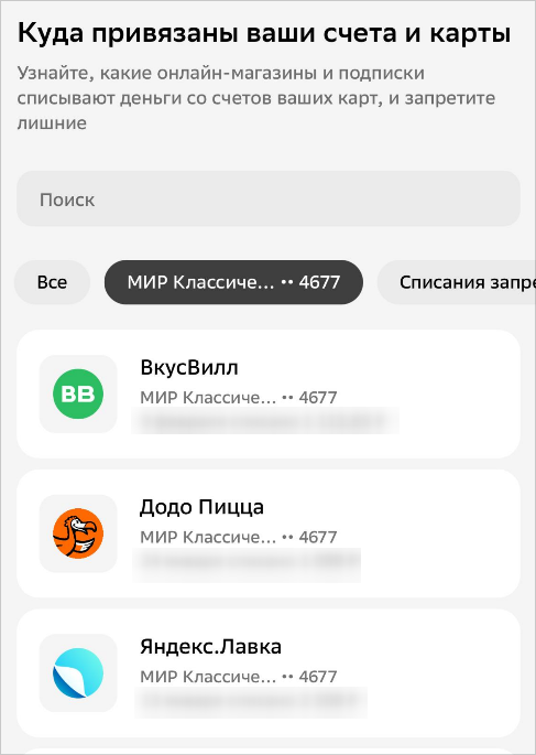 Посмотрите активные подписки в мобильном банке. Например, в Сбербанке информация находится в разделе «Куда привязаны ваши счета и карты».