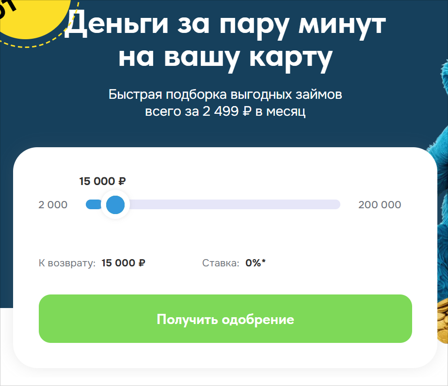 На сайте компании — форма с суммой займа, ставкой 0% и кнопкой «Получить одобрение». Но фактически это не кредитор, а сайт-посредник, который собирает и анализирует данные, предоставляет доступ к витрине кредитных предложений и рассылает заявки на займы в разные МФО.