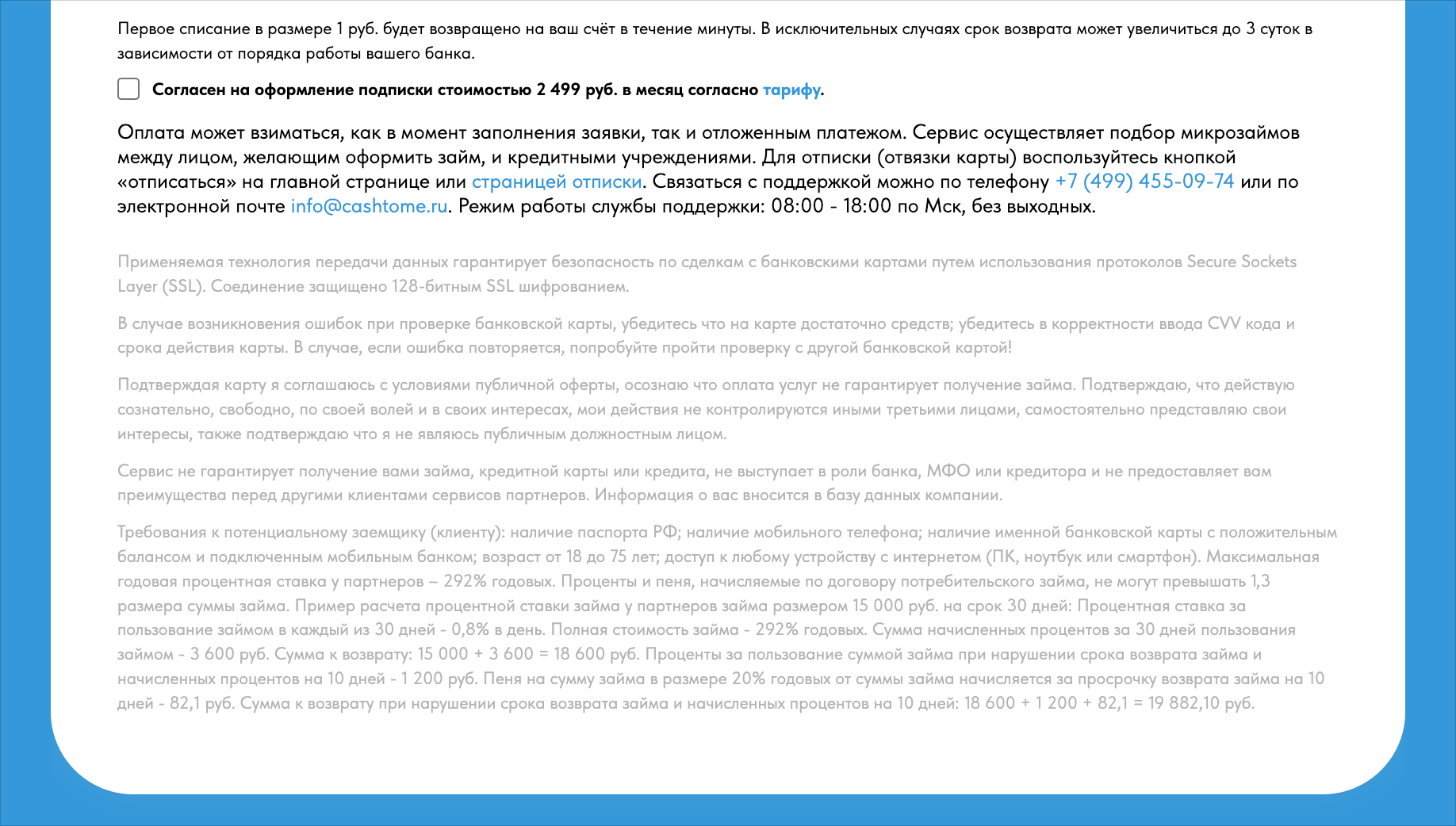 Условия подписки были скрыты или изложены неочевидно. В случае с CashToMe этот аргумент тоже не сработает, потому что условия подписки никто не скрывает, а при вводе данных карты нужно поставить галочку напротив согласия с тарифом. В нем четко сказано, что оплата ежемесячная.