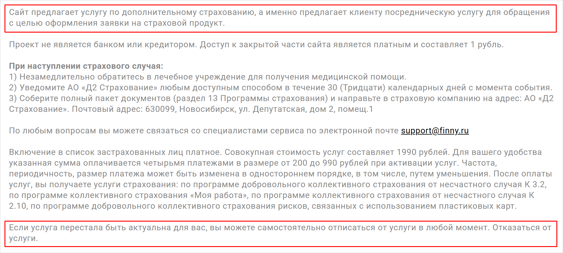 Finny (финни.ру) — посреднический сервис, который берет вознаграждение за услуги, связанные со страховкой. Подвох в том, что при заполнении заявки некоторые пользователи пропускают условие о платной подписке, и такая невнимательность обходится им в 1 990 рублей.