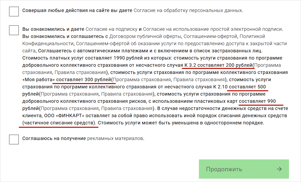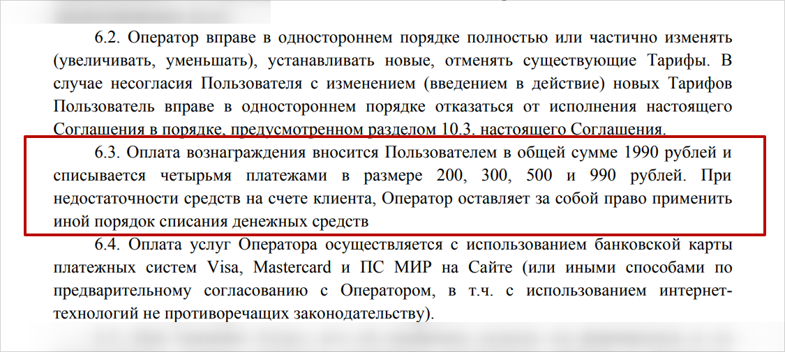 Сколько стоят платные услуги. По условиям на сайте общая сумма оплаты — 1 990 рублей. Но интересно, что вознаграждение списывают частями: 200, 300, 500 и 990 рублей. Если денег на карте недостаточно, очередность платежей может измениться.