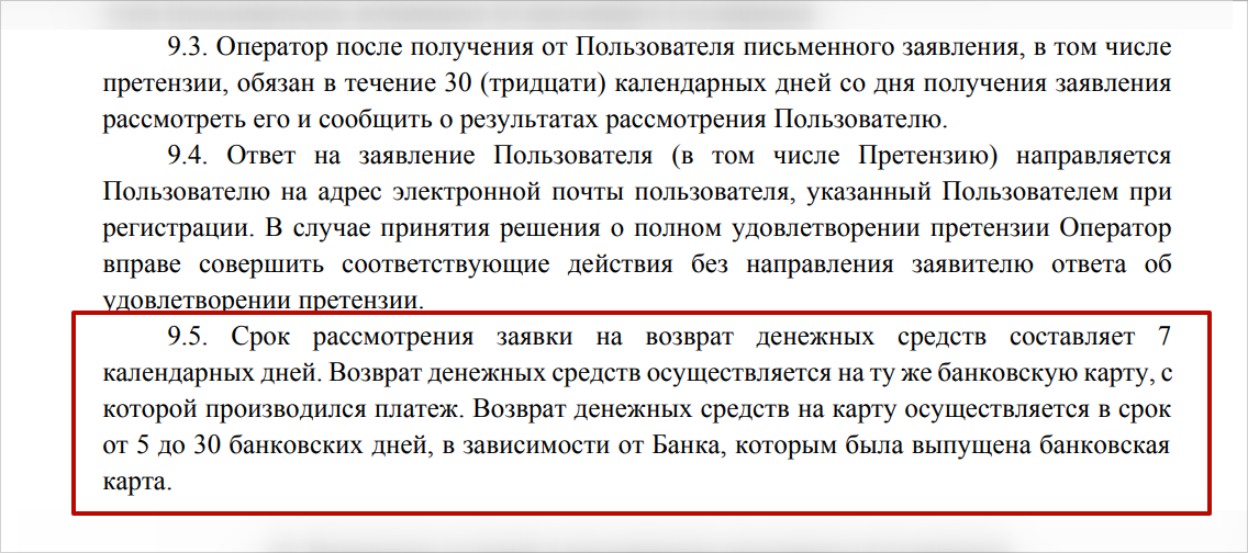 Деньги не возвращают сразу после заявления. Сначала компания проверяет данные и рассматривает обращение. Обычно это занимает 7 календарных дней. Если возврат одобрят, деньги отправят на ту же карту, с которой проходила оплата. Часто зачисление занимает от 5 до 30 банковских дней после подтверждения.