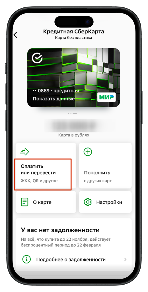 Чтобы перевести деньги с кредитки Сбера в приложении «Сбербанк Онлайн», нужно действовать так же. Открыть приложение, выбрать кредитную карту, затем — «Оплатить или перевести», указать получателя и сумму.