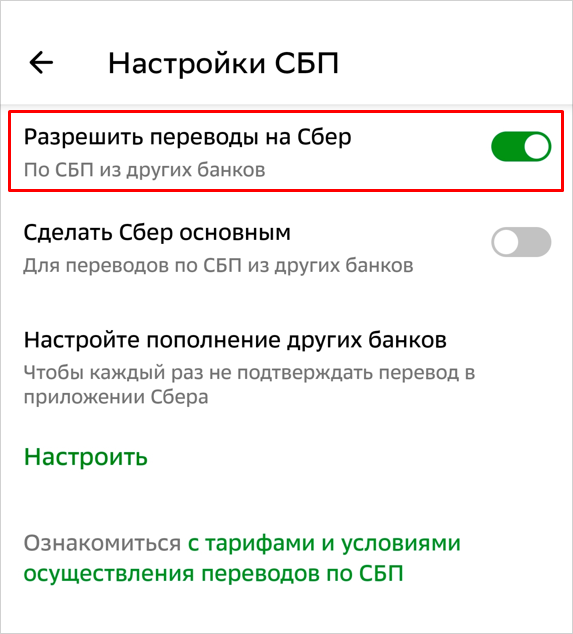 - Убедиться, что переключатель напротив параметра «Разрешить переводы на Сбер» включен.
