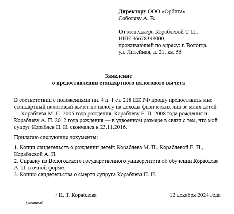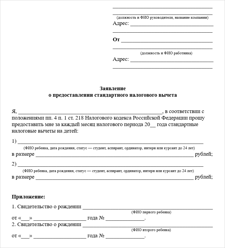 Заявление на предоставление стандартного налогового вычета пишется в произвольной форме.