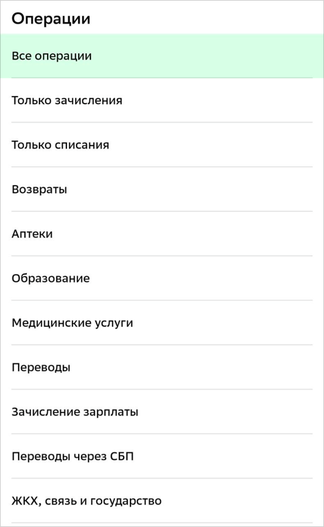 - Если хотите получить информацию об отдельных операциях, переведите кнопку «Дополнительные фильтры» в активное положение. Укажите, какие операции вас интересуют.