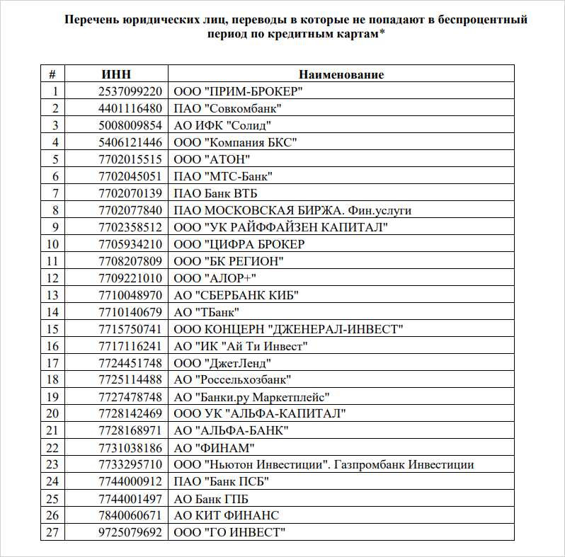 Но есть исключения: на платежи в пользу отдельных юридических лиц из этого списка грейс не действует, даже если организация есть в каталоге.
