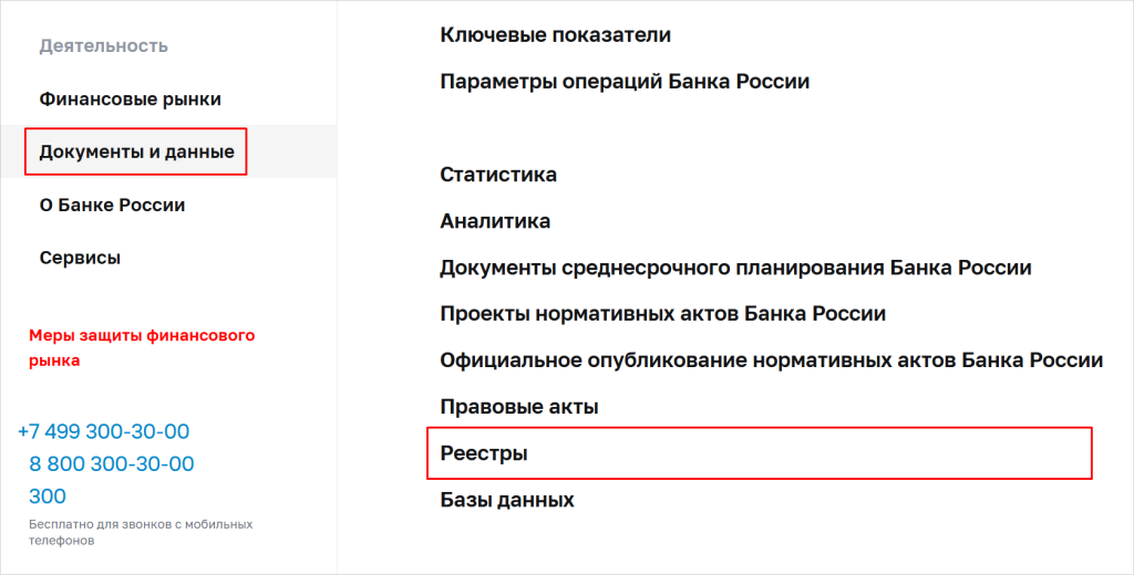 - На главной странице cbr.ru откройте меню. Выберите «Документы и данные», затем «Реестры».