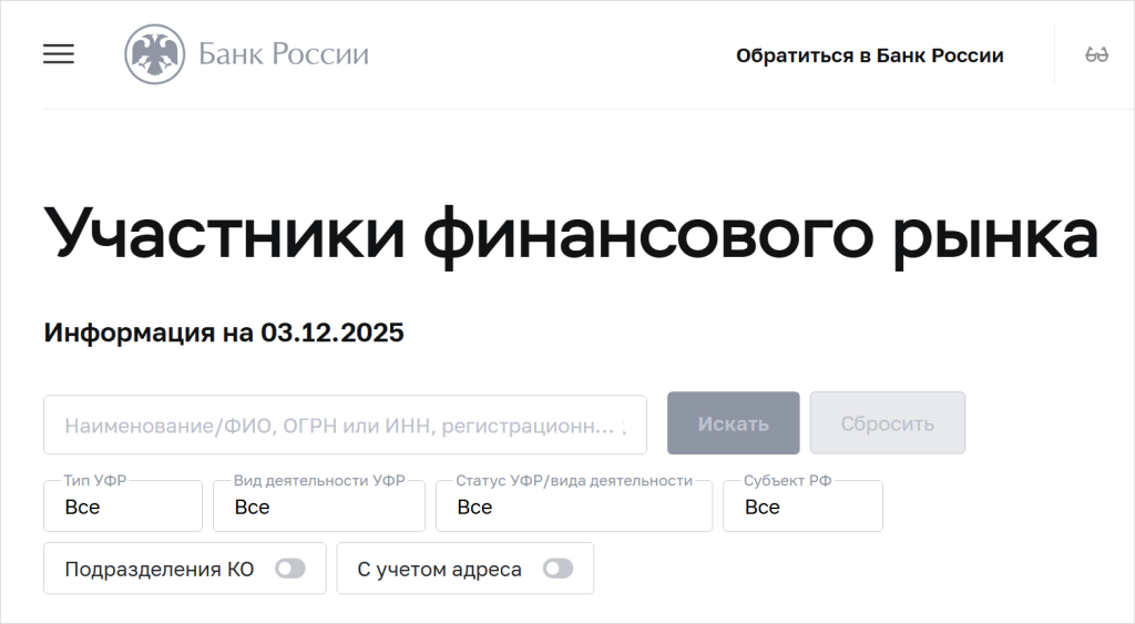 - Откройте раздел «Участники финансового рынка». Это официальный справочник, в котором можно проверить легальность любой финансовой организации, в том числе брокера.