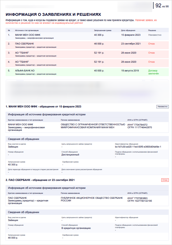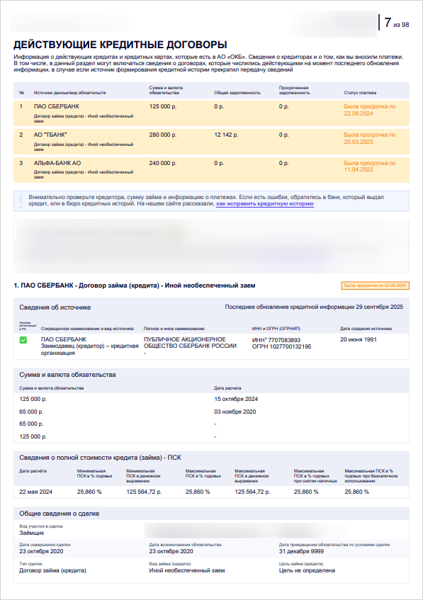 В отчете видны все кредиты и займы в МФО, оформленные за последние 7 лет. Если вы заметите в нем кредит, который точно не брали, это может означать, что вашими персональными данными воспользовались мошенники.