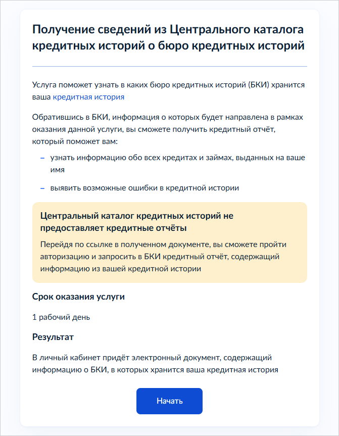 - Откройте услугу «Получение сведений из Центрального каталога кредитных историй о бюро кредитных историй» и выберите «Начать».